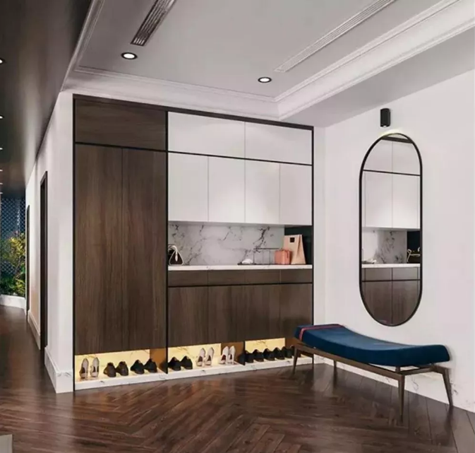 早幾年裝修,人們還沒有太多定制柜的概念,通常就在門廳處設(shè)置一個(gè)小鞋柜,解決進(jìn)出戶的藏鞋需求,有的是木工打制,有的是家居賣場(chǎng)買來的成品柜。例如這種。↓↓↓