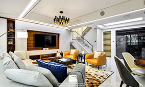 利用臺(tái)階,制造高低層次分區(qū)效果,隔開辦公區(qū)和影音區(qū),增加整體空間感